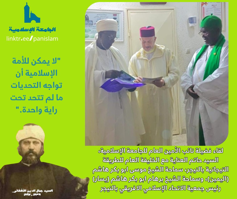 في إطار جهودها لتعزيز الوحدة والتعاون، عقدت الجامعة الإسلامية لقاءً مثمراً مع قادة الطريقة التجانية في جمهورية النيجر، حيث جرى التأكيد على أهمية تنسيق الجهود المشتركة لمواجهة التحديات التي تعصف بالأمة الإسلامية، والعمل على بناء شراكات استراتيجية تدعم مسيرة النهضة والوحدة.
